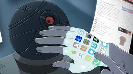 スマートフォンに代わる次世代ウェアラブルデバイス。手のひらや甲に、プリンターで画面やコンピューターを印刷するので、まるで手の裏表がスマホになったように見えるのが特徴。